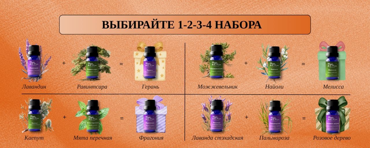 К специально подобранных парам мы добавили особенно ценные масла, которые сэкономят вам приятную сумму. Выбирайте 1-2-3-4 набора: