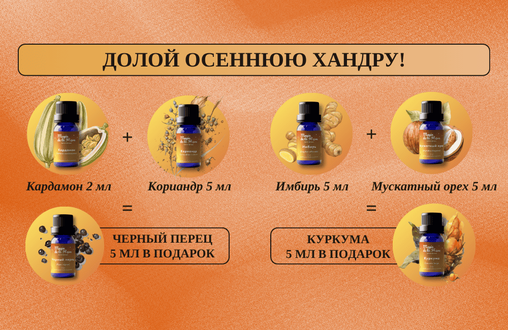 ЭМ кардамона (10 мл) + ЭМ ЭМ кориандра (15 мл) = ЭМ чёрного перца (15 мл) в подарок